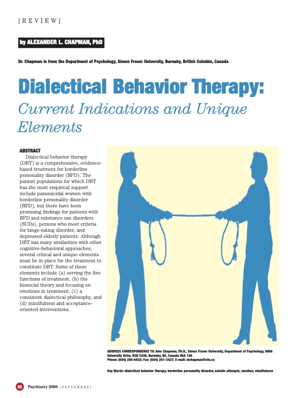 DBT stands for Dialectical Behavior Therapy and it is an evidence-based treatment for borderline personality disorder, depression, anxiety, and PTSD, as well as suicidal ideation, self-harm, substance use, and disordered eating. It consists of building skills in the areas of mindfulness, interpersonal effectiveness, emotion regulation, and distress tolerance to create a life you want to live.